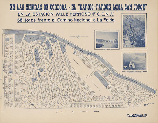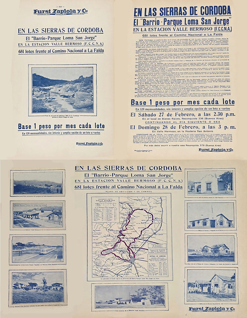El folleto es un documento publicitario de 1937 emitido por Furst Zapiola y Cía., una empresa inmobiliaria con sede en Buenos Aires. Anuncia la subasta de 681 lotes en el "Barrio-Parque Loma San Jorge", ubicado en la Estación Valle Hermoso (F.C.C.N.A.), Sierras de Córdoba, frente al Camino Nacional a La Falda.